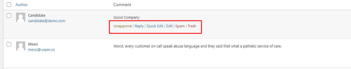 To manage the Comments, please navigate to Comments in your left sidebar. Now you can see a list of comments. Select Comment needs to manage. Then, Select the status that you want.