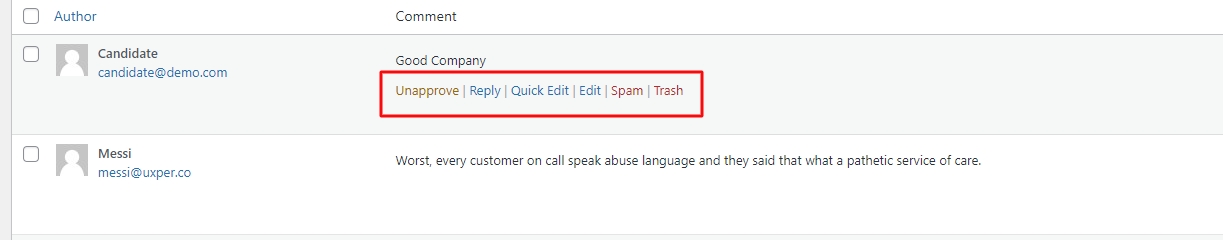 In the admin, the comment module will summarize the candidate's comment records. You can quickly manage the freelancer's comments directly.