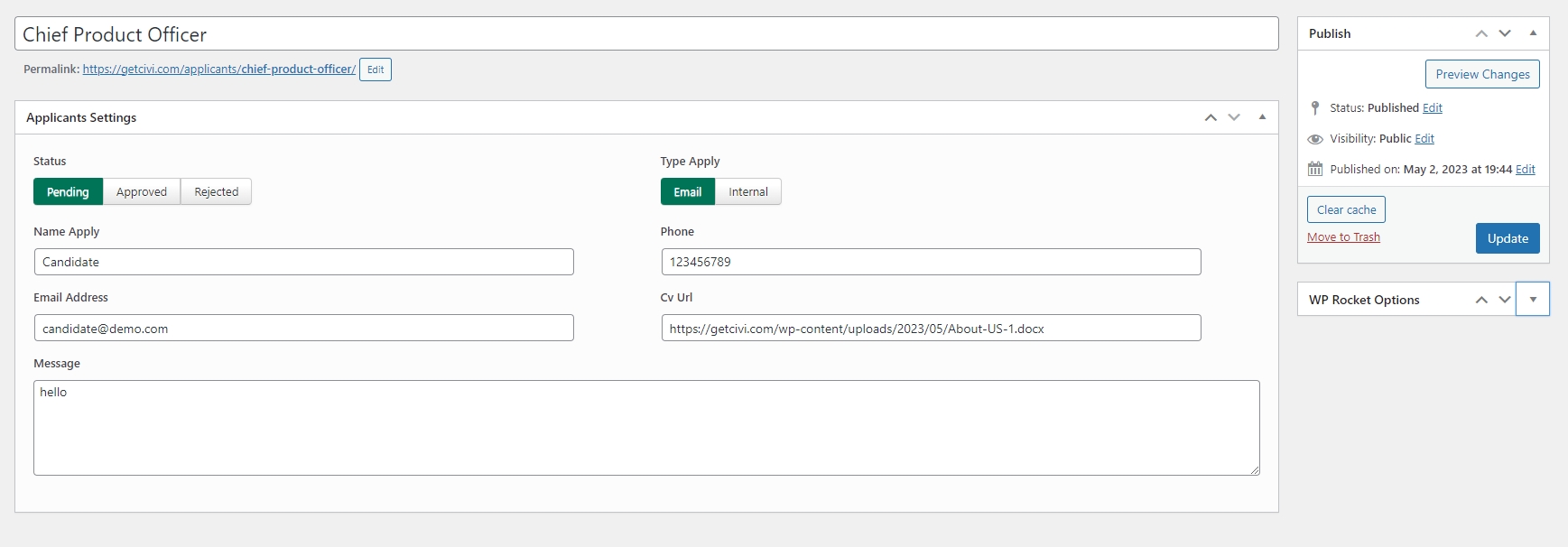 In the admin, the applicant's module will summarize the candidate's job application records. You can directly approve the candidate's profile easily.