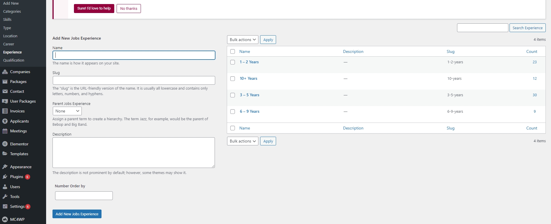 To create a new Experience, please navigate to Jobs -> Experience in the left sidebar. Now you can start adding specific information about the Job Experience Item in the fields data section below: