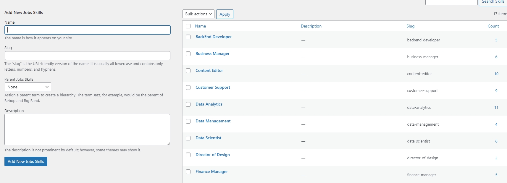 To create a new Skills, please navigate to Jobs -> Skills in the left sidebar. Now you can start adding specific information about the Job Skills Item in the fields data section below: