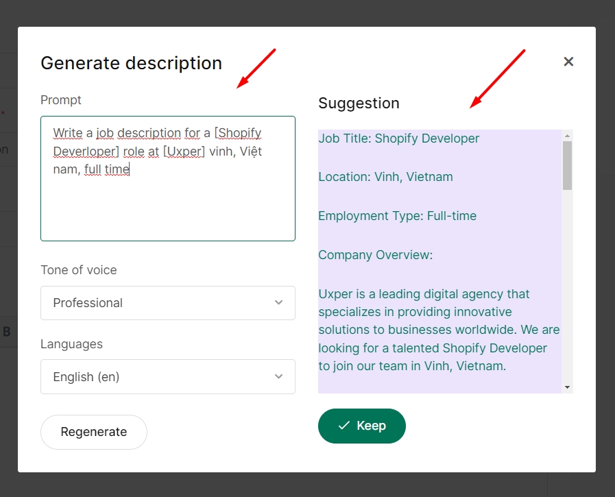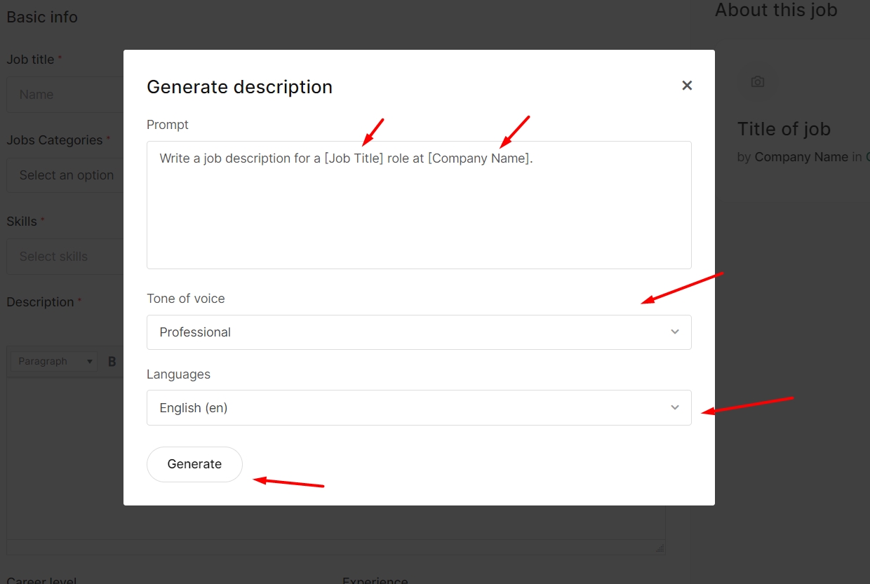 - In Employer Dashboard, go to Post a Job -> Description -> Select AI Helper