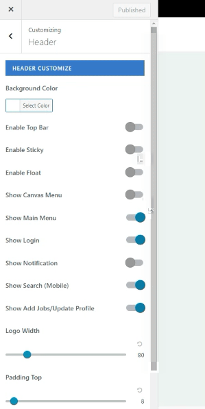 Header Customize will allow you to quickly change the background color; show more options or set padding to the header. Go to Admin-> Appearance -> Customize