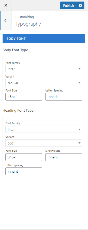 Here you set properties like Font Family, Font Size, Variant, Light Height, and Letter Spacing for Body font.