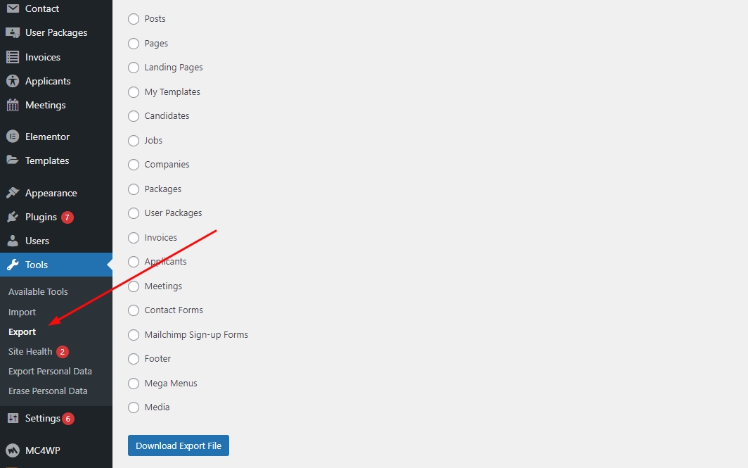 Go to Admin Dashboard -> Tools -> Export