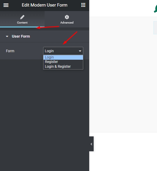 In Elementor, please use the widget Modern User Form -> Select the form that you want